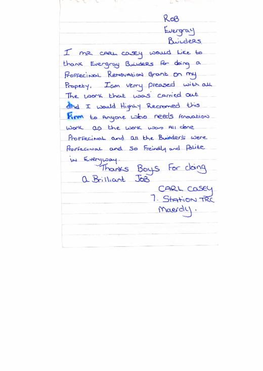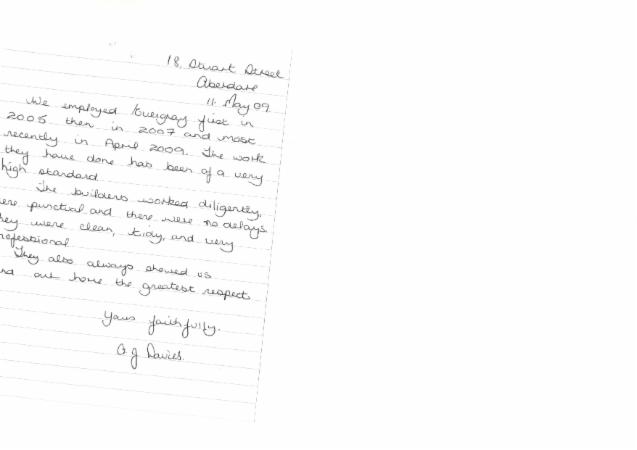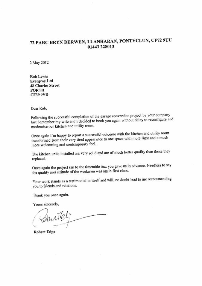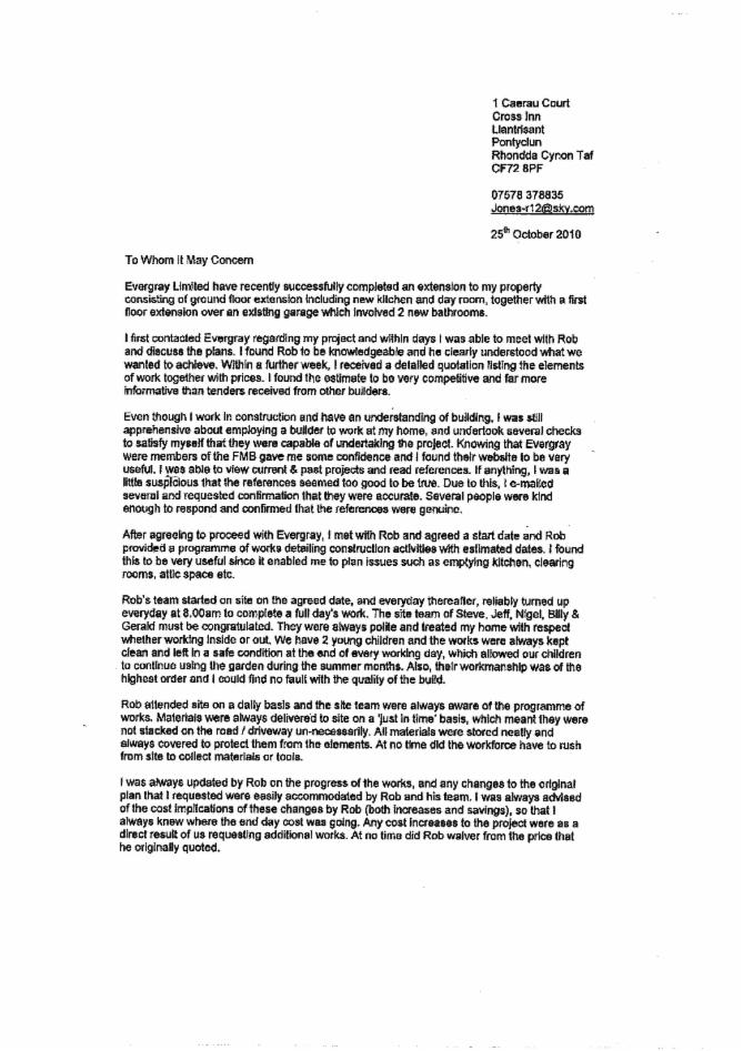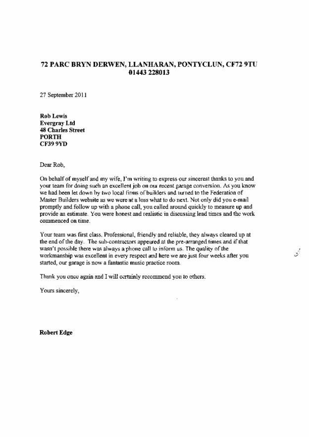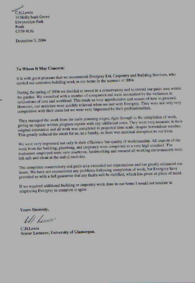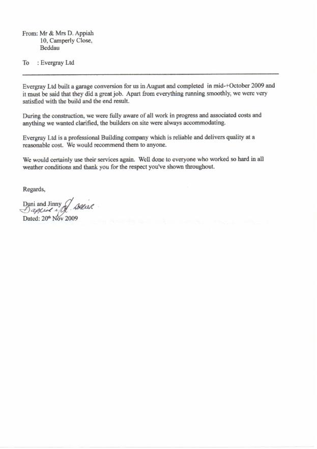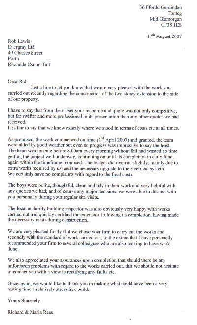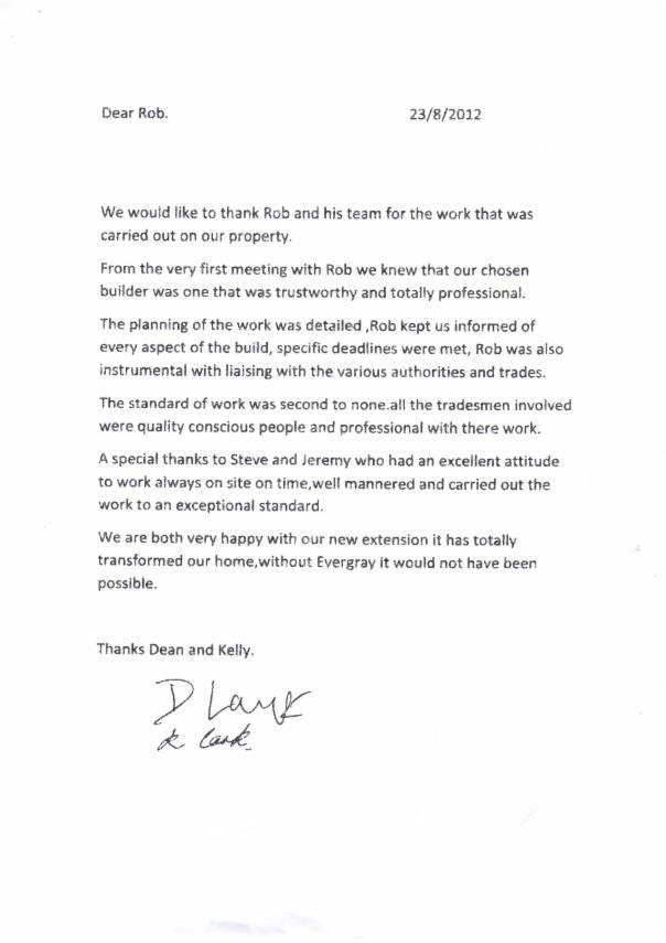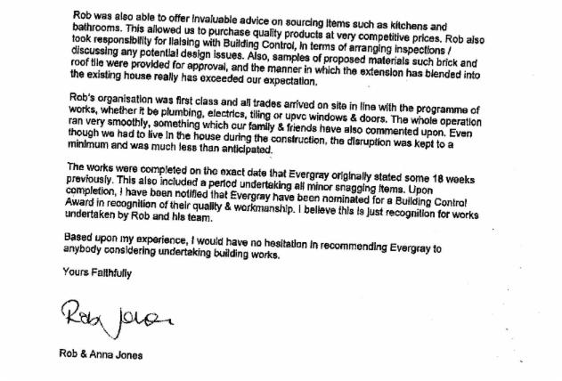 Hello Rob, here is our reference. Any problems contact us. Evergray built us a 2 storey extension and we highly recommend them. We are very pleased with the standard of work and would not hesitate to use them again, we were kept up to date regarding its progress, options available and price. The workforce were prompt, polite and hard working. Any disruption was kept to a minimum and the site was always kept as clean as possible. As a result of good planning not one working day was lost over a period of 4 months. Thank you very much, all the best for the future.