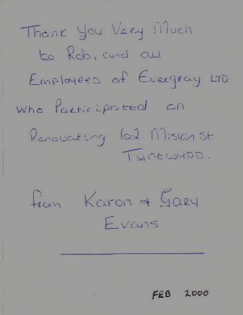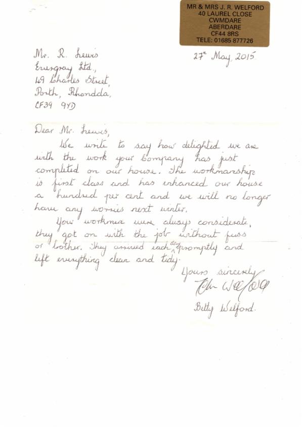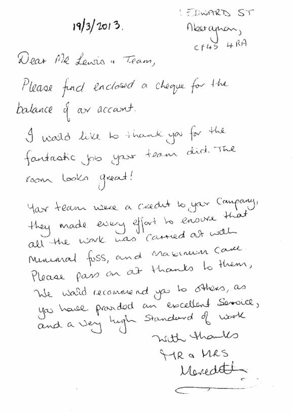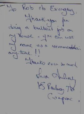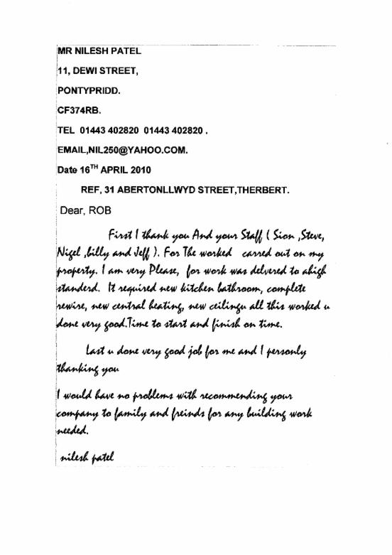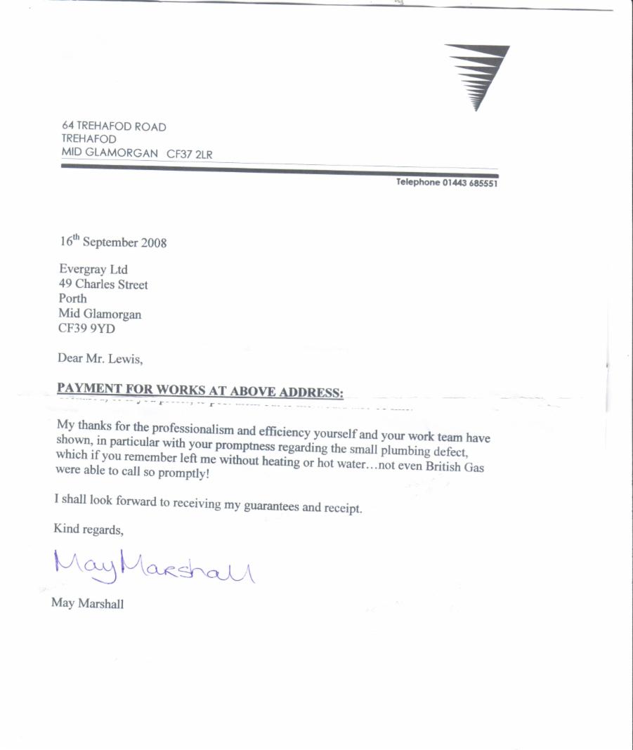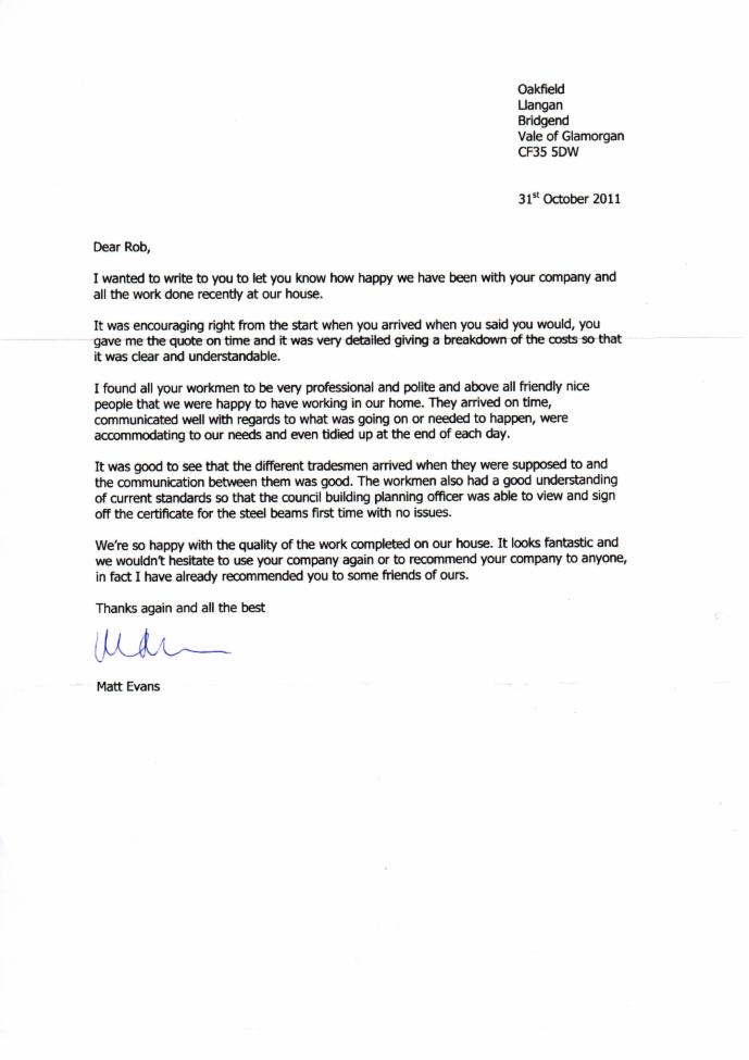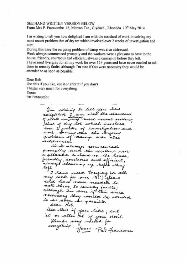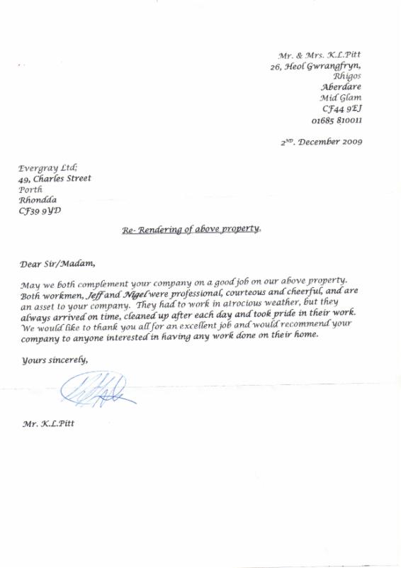 Hello Rob, here is our reference. Any problems contact us. Evergray built us a 2 storey extension and we highly recommend them. We are very pleased with the standard of work and would not hesitate to use them again, we were kept up to date regarding its progress, options available and price. The workforce were prompt, polite and hard working. Any disruption was kept to a minimum and the site was always kept as clean as possible. As a result of good planning not one working day was lost over a period of 4 months. Thank you very much, all the best for the future.