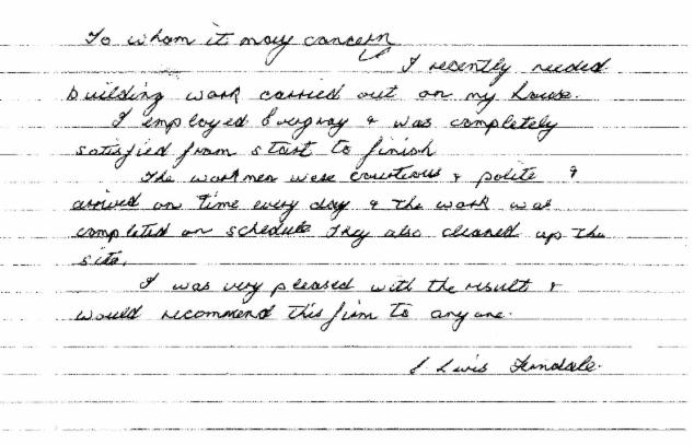 Just a quick note to thank you for the building work you have recently completed for me. Both I and my husband are over the moon with the extension. You managed the project so professionally and diligently that it run smoothly and on-time. Any changes to plan were discussed fully and I always received revised schedules or costing so I always knew the running costs of the project. Your employees turned up everyday and work liked real troopers to get the extension complete. They were always polite and always cleaned up after themselves at the end of the day. They were hard-working and always explained in detail what they were doing if I would ask. They were very knowledgeable and just very pleasant people.